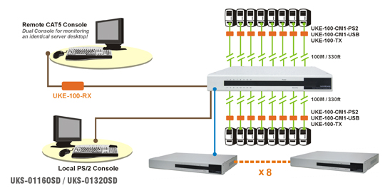 1用户双控制台× 32端口双控制台CAT5 KVM切换器/ OSD菜单,菊花链式 |